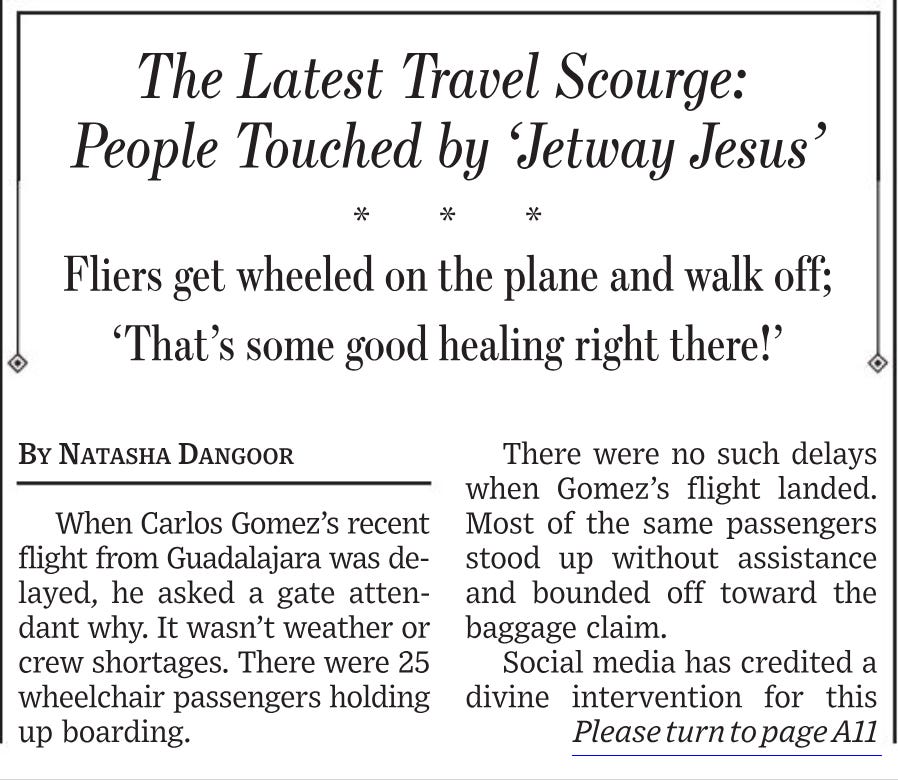 (4) There Is a Special Place in Hell for Those Who Use Handicap Services Who Aren’t Actually Handicapped: What has the world come to when people use services they are not entitled to use? We first saw this trend down at Disney when out-of-towners would hire local handicap people for the day to use the disabled line for rides (before FAST PASS became a thing). Then, we saw the mass proliferation of people using handicapped placards to park in handicap parking spaces only to get out of their cars and walk as strongly as I walk into the building. Now, people are using wheelchairs at airports so they and their entire family can board before anyone else. This trend started at Southwest due to how it boards airplanes, but has spread to all the airlines. When my lovely lady friend and I flew to London in October, I counted over thirty wheelchairs in the boarding area, with some accompanying families reaching five members. Now, I partially blame the airlines for allowing ALL family members to board instead of just one to assist the alleged handicap person, as well as allowing those using the service to bring a full suitcase on board—one guy nearly fell over trying to use his cane and move his suitcase. These two elements incented the abuse we are now seeing everywhere. As in the article below, not surprisingly upon arriving in London only three of those people who used wheelchairs in America needed them in London. The magic of modern air travel indeed.