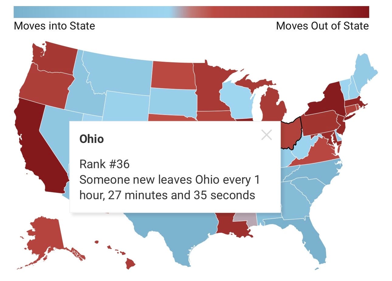 P.P.S. My friends over at the National Taxpayers Union Foundation issued a new report, “Interstate Migration in Minutes: How Fast Are Taxpayers Leaving or Entering Each State?” Despite rosy press releases from Governor Mike DeWine, Republicans in the Ohio House and Ohio Senate, and JobsOhio, Ohio isn’t winning the fight to keep and gain citizens. Not only isn’t Ohio winning, it is actually losing quite badly. Based on the data, NTUF ranks Ohio #36 with “someone new leav[ing] Ohio every 1 hour, 27 minutes, and 35 seconds.” Thus, every time you watch a movie, an Ohioan has stopped being an Ohioan to become a Floridian (#1), Texan (#2), North Carolinian (#3), South Carolinian (#4), or Tennessean (#5).
