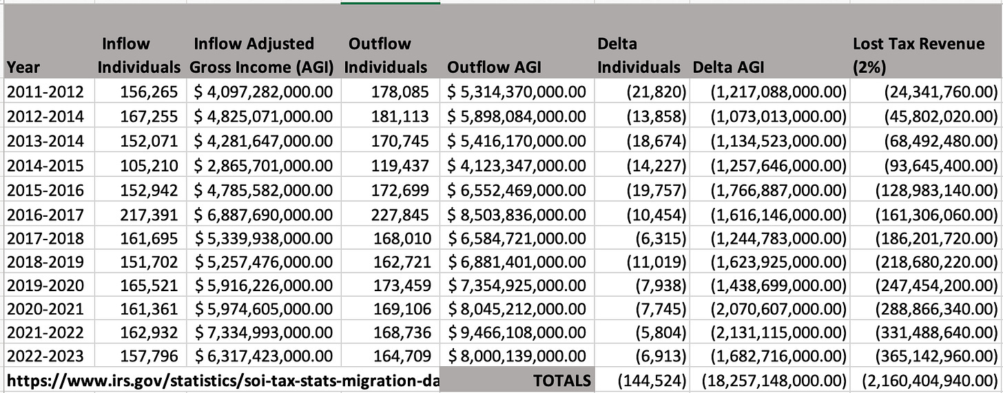 Over 12 years, due to net out-migration, Ohio lost $2.16 billion in tax revenue at BOTH the state and local level. It also lost the best and brightest doers to places like Florida, Tennessee & Texas.