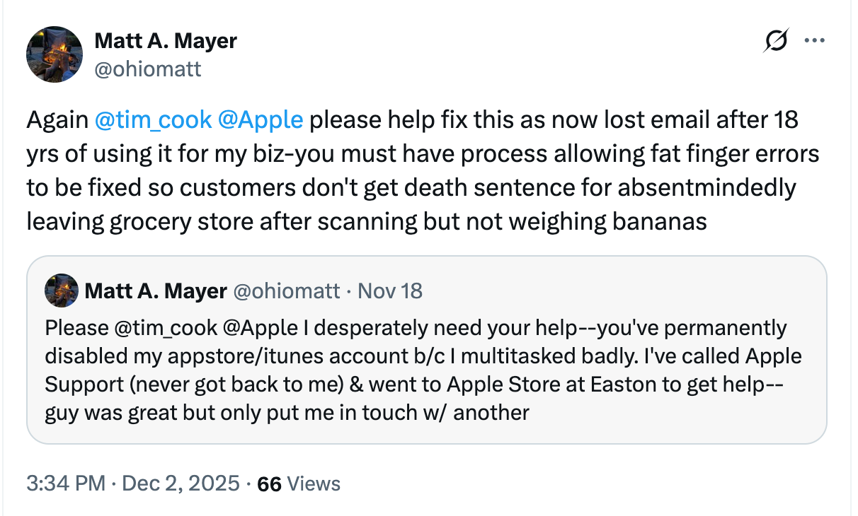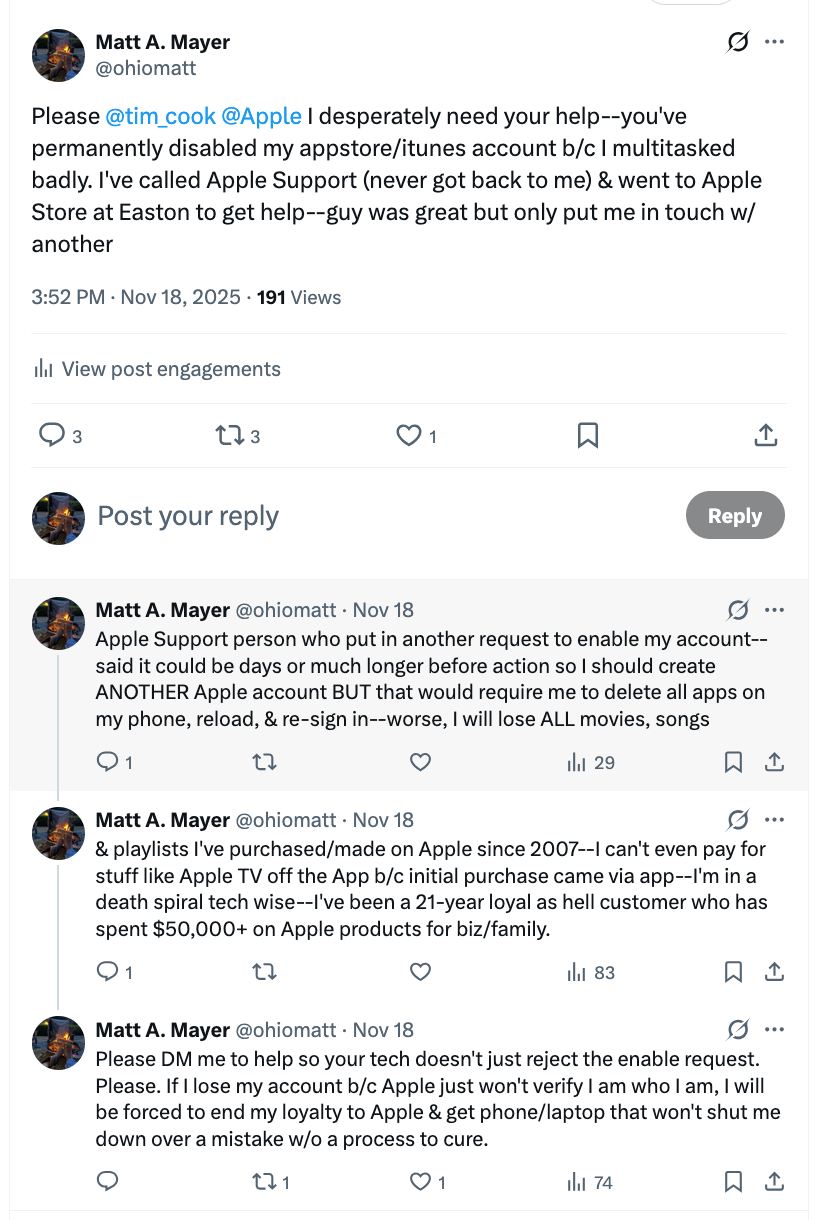It all started on Monday, November 10, 2025. I was cooking dinner for my family while listening to music on my iPhone. I got an update message from Apple about the credit card tied to the Apple App Store. It was expiring, so needed to be updated. I made what turned out to be a fateful decision to update the credit card as I was busily cooking dinner. In my effort to multitask, I failed to notice that the expiration date of the new credit card was a month earlier than the old credit card, so I put in the old month three times. After the third time, Apple froze my App Store account telling me it had been “permanent disabled.” I figured “permanent” didn’t really mean “permanent,” so I used the Apple AI customer support tool to get the issue fixed. The useless AI tool merely kept sending me the link to the Apple Customer Agreement document in which it states under Section G: