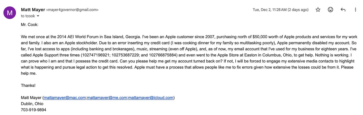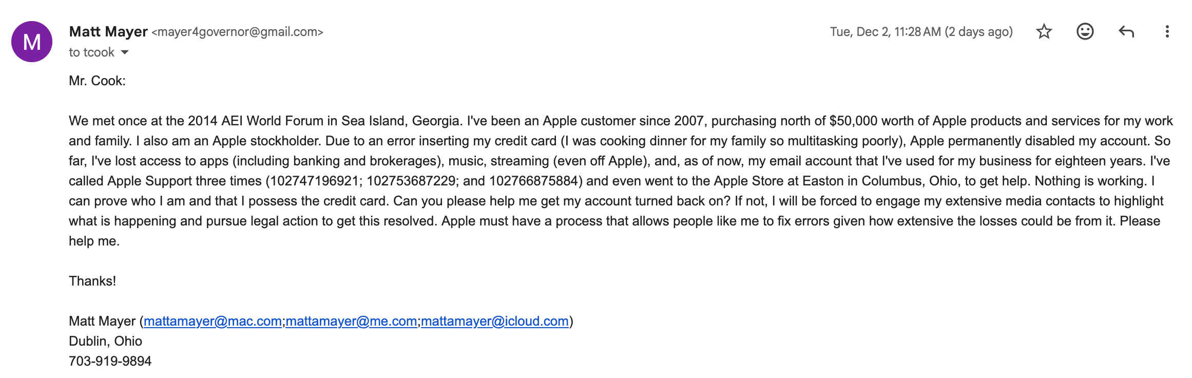 After this last request via Apple Customer Support, I sent the following email to CEO Tim Cook via a Google email: