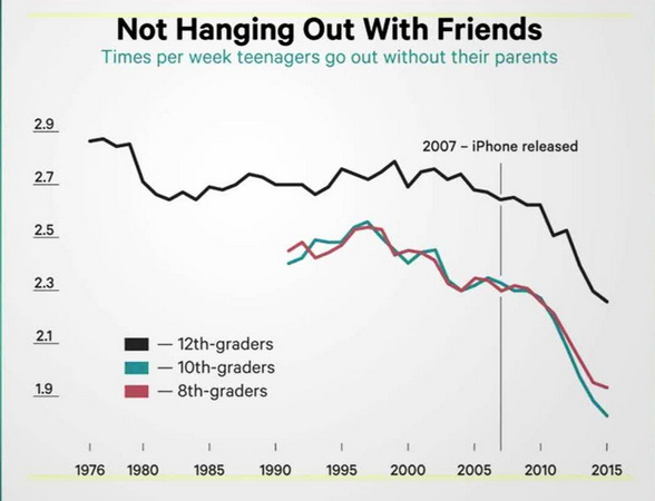 With the mass distribution of smartphones and social media apps to our kids, we are raising a generation who believes whatever it is they are doing is of the utmost importance (see countless pictures and videos posted showing them doing pretty much nothing) AND gratification should be instantaneous (stream all episodes now; gets likes of posts immediately; wifi is a human need, not want). How many parents have watched a group of kids sitting next to each other not talking in real life, as they interact over social media? This reality is why many of them find it hard to establish deep, meaningful relationships with peers; struggle to date; have mental health issues; and spend so much time alone in their kids caves on a perfectly sunny, warm day. Teen suicide rates have increased along with smartphone adoption. That should be a red flag, yet it isn’t.