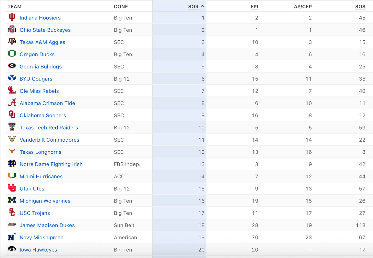 Secondly, I think the term “ranked X when they played” should be banned from college football. Again, does it really matter that Clemson was ranked fourth when it lost to Louisiana State University? Is that really a quality win? Isn’t it more important to look back at the end of the season to determine how the teams each team beat ended up doing across an entire season? This aspect goes to the strength of schedule issue. Is a 10-1 team who didn’t beat any teams ranked in the top twenty at the end of the season really better than a 9-3 team that lost two games to top ten ranked teams, but also won three games against top ten ranked teams? Look at the ESPN rankings below that combine rankings, Football Power Index (measures team’s true strength on net points scale; expected point margin vs average opponent on neutral field), and strength of schedule. If you are a Texas or Vanderbilt fan, you might be pretty frustrated that you are outside the CFP ranking looking in (before this weekend’s wins) while Notre Dame and Miami are ahead of you. Texas’ big win over undefeated and third ranked Texas A&M only resulted in it moving up two spots in the AP poll, as Vanderbilt’s thumping of Tennessee saw it DROP a spot in the AP poll. How will the CFP committee react to this weekend’s results?